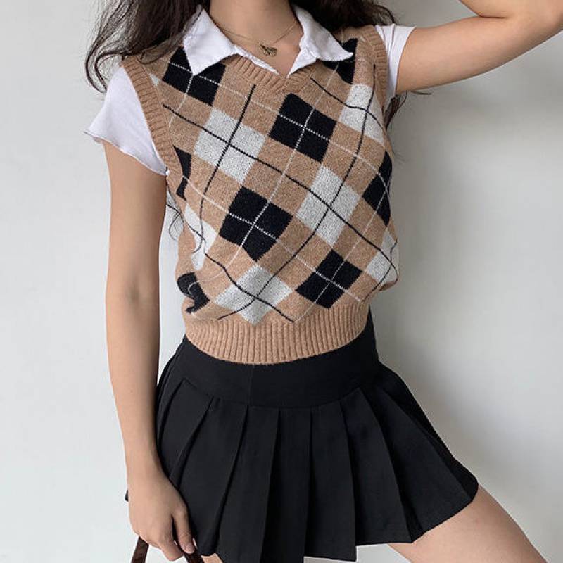 Preppy Aesthetic Outfits Short Retro Pullover Rhombus Knitted Vest Jacket Women's Pullover