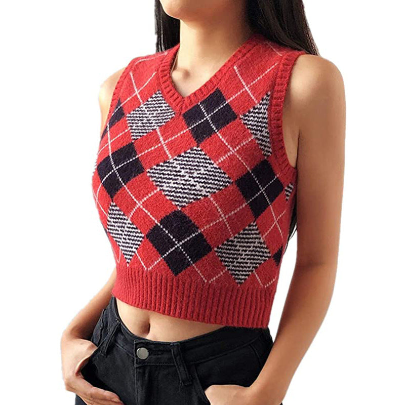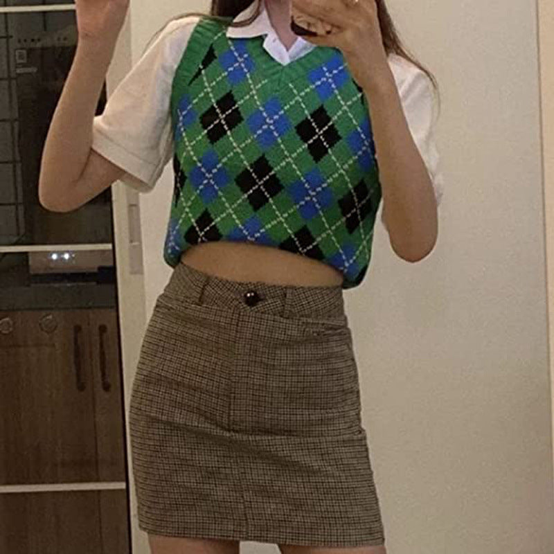 Preppy Aesthetic Outfits Women's Diamond Plaid Sleeveless Sweater Preppy Style Woolen Vest for Women