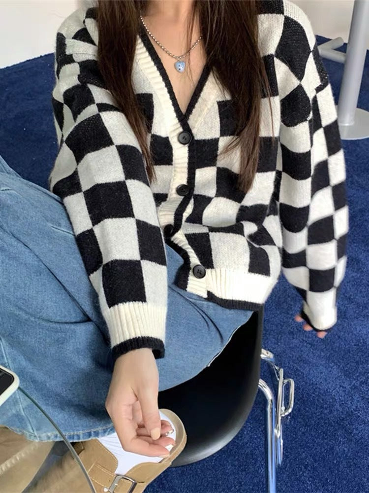 Preppy Aesthetic Outfits Chess Plaid Sweater Coat