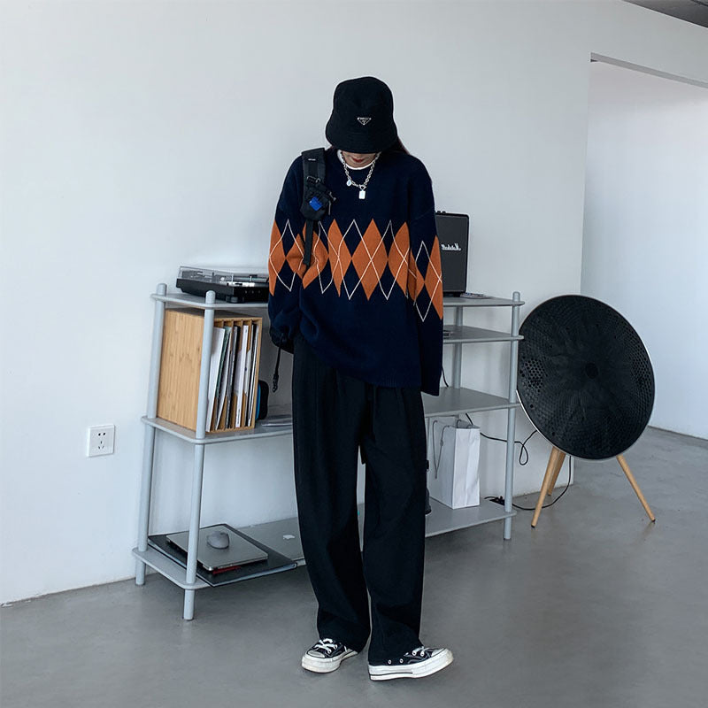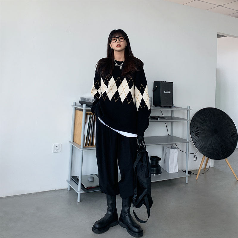 Preppy Aesthetic Outfits Rhombic Round Neck Sweater Coat