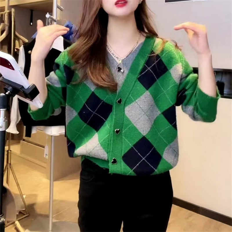 Preppy Aesthetic Outfits Rhombus Plaid Cardigan Sweater Women's Coat