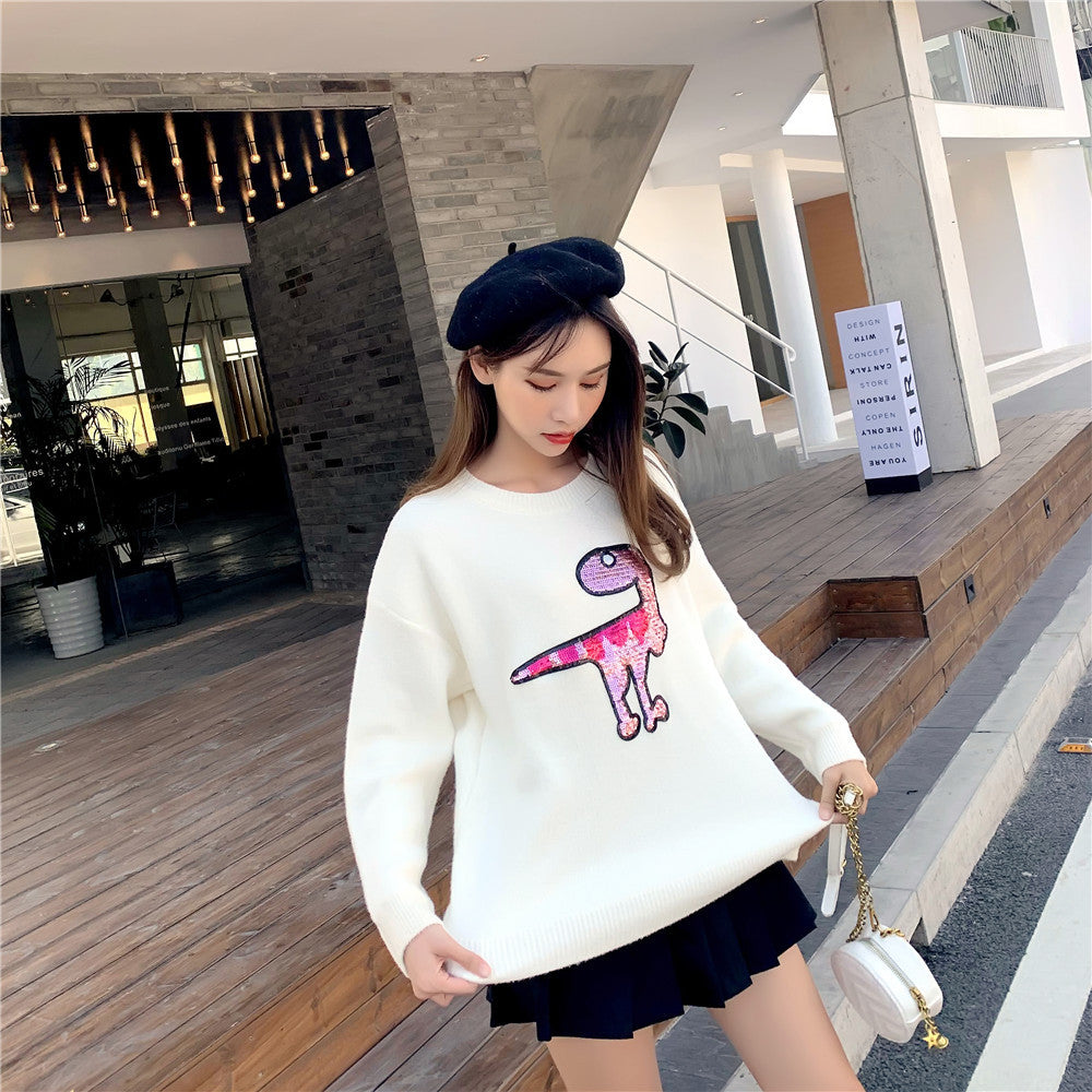 Dinosaur Sweaters Embroidered Sequins Dinosaur Loose Pullover