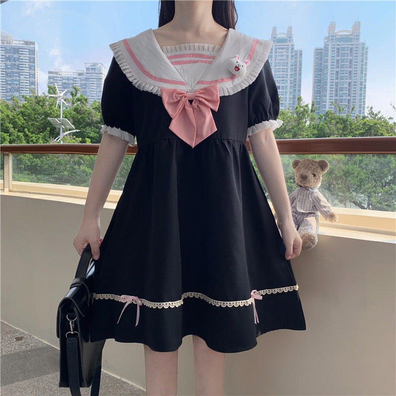 Gothic Lolita Harajuku Style Clothing Personality Stitching Sailor Collar Rabbit Ears Contrast Color Short Sleeve Dress