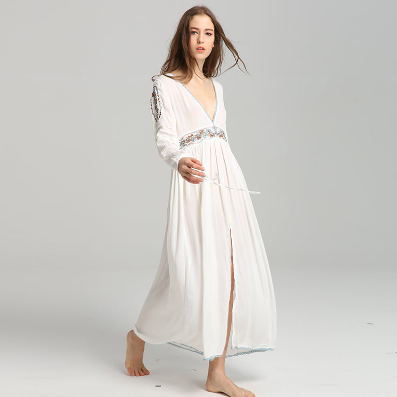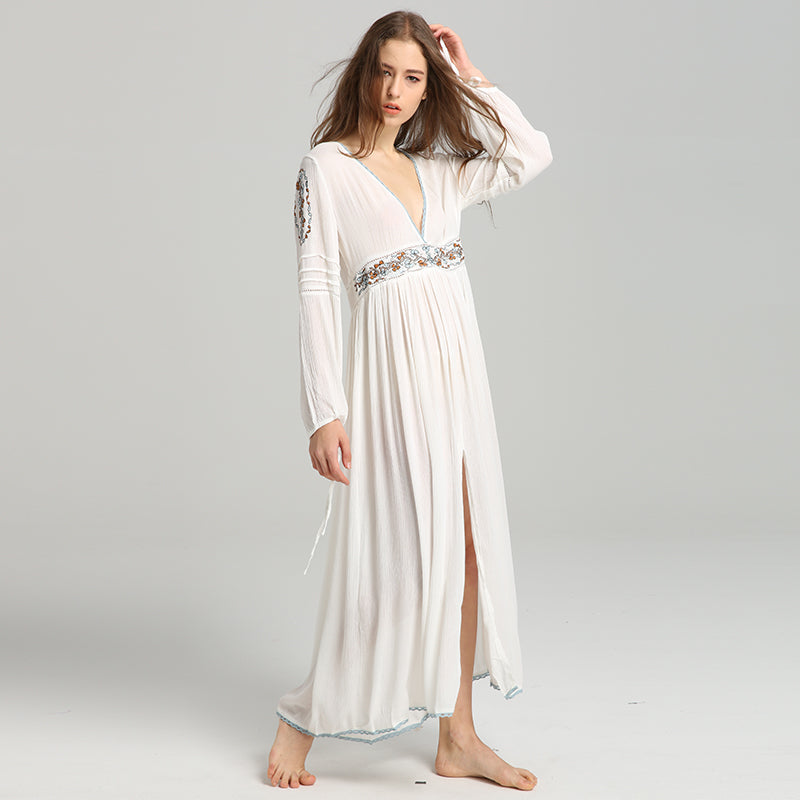 Women Dresses Bohemian Long Sleeve Embroidered Split Dress