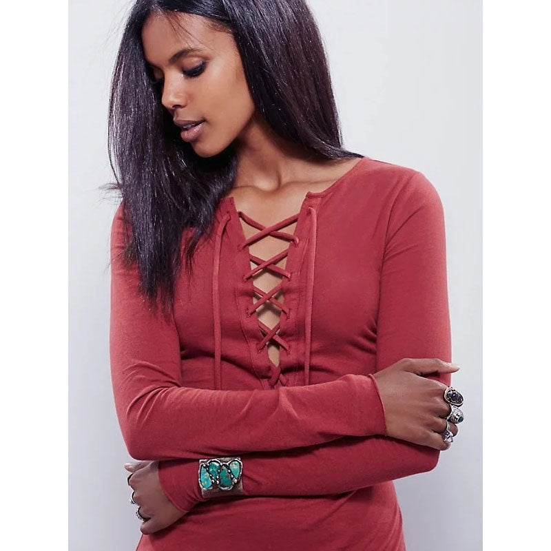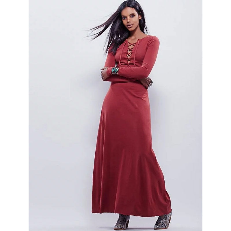 Women Dresses Deep V-neck Tied Cotton Dress Long Skirt