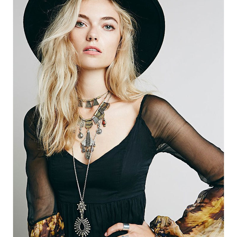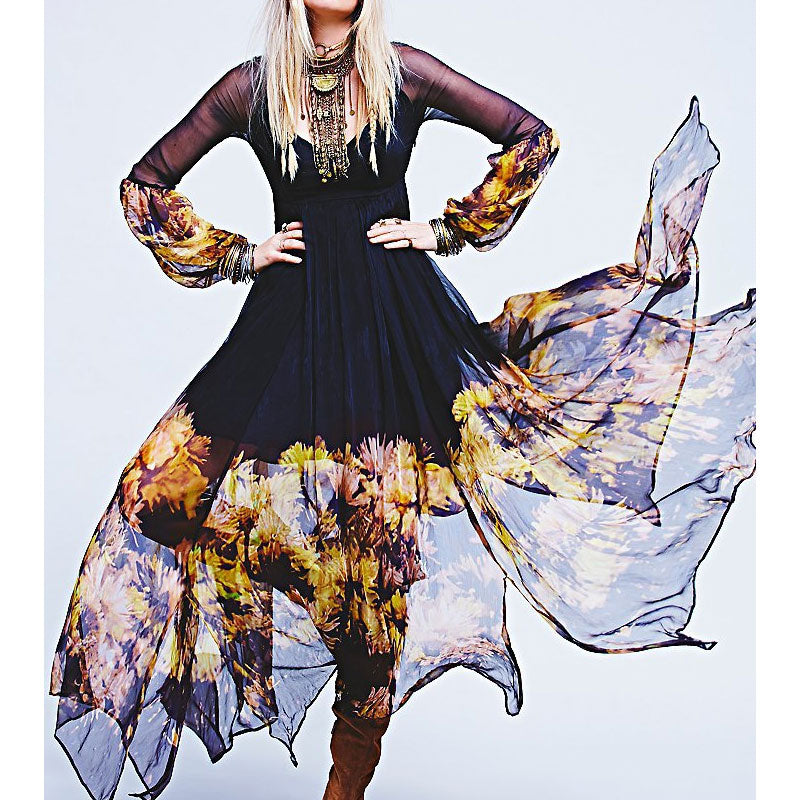 Women Dresses Bohemian Pleated Dress Hem Large Flower Printed Long Sleeve Dress