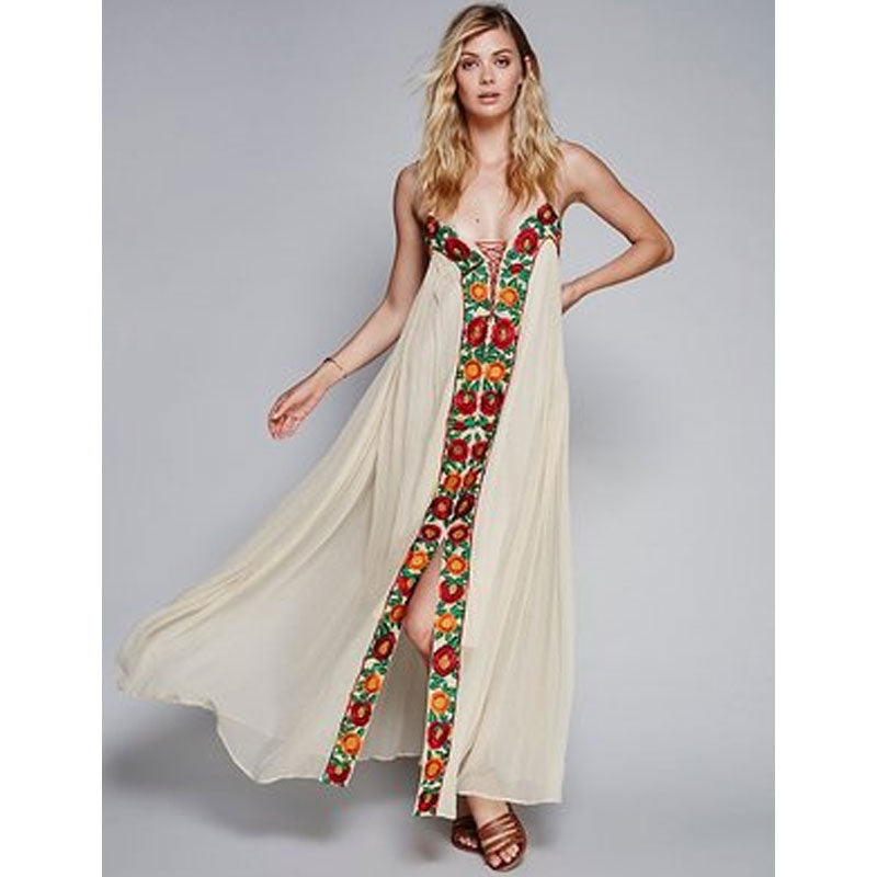 Women Dresses Flower Embroidered V-neck Backless Sexy Suspenders Holiday Dress Long Dress