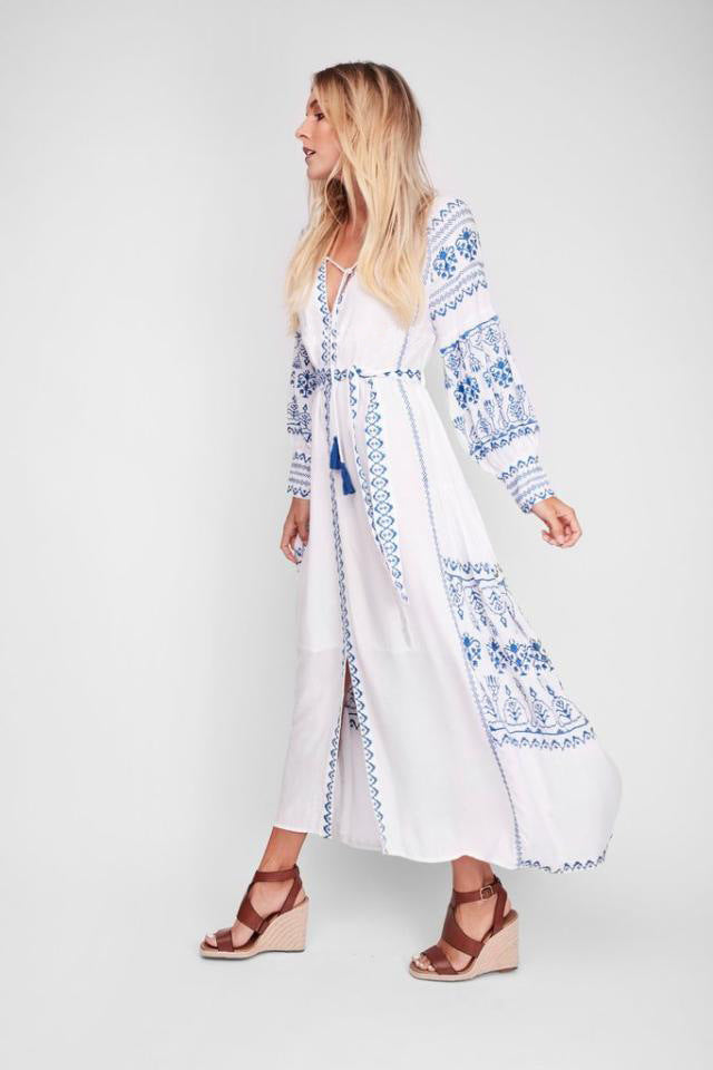 Women Dresses Bohemian Holiday V-neck Embroidered Lantern Sleeve Dress