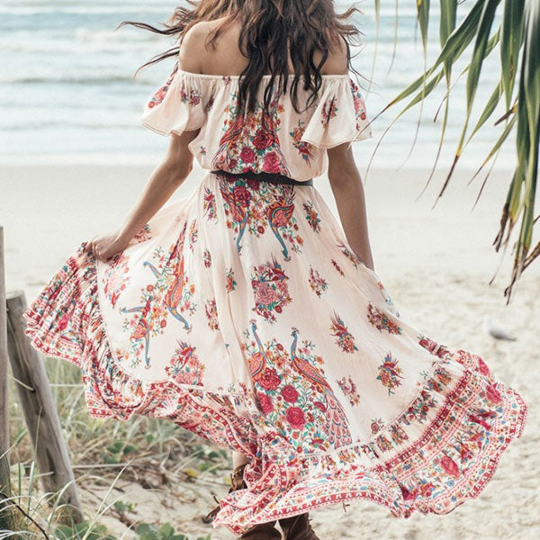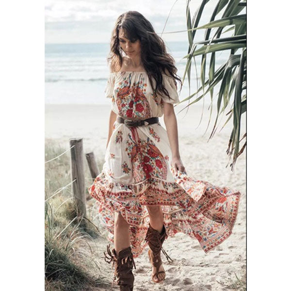 Women Dresses Summer Bohemian Beach Sexy Vintage Print Lace-up Dress