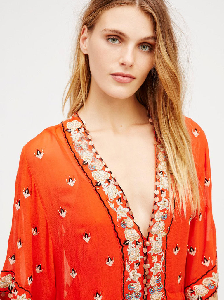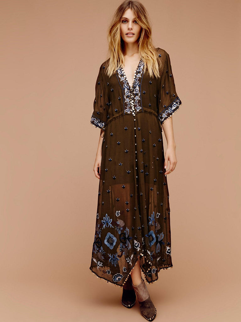 Women Dresses Embroidered See-through Flower V-neck Dress