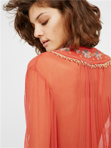 Women Dresses Deep V-neck Embroidery Pattern Wide Sleeve See-through Shirt Dress