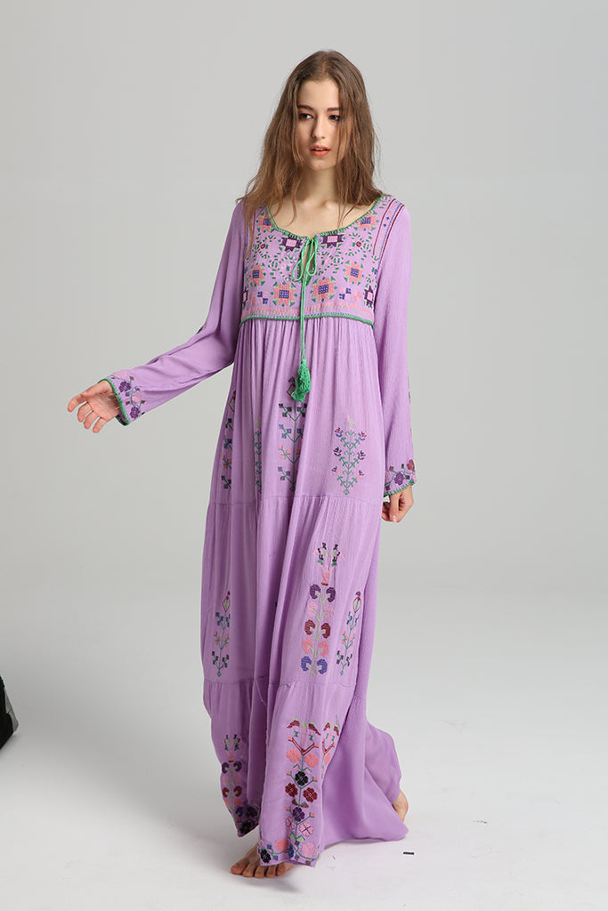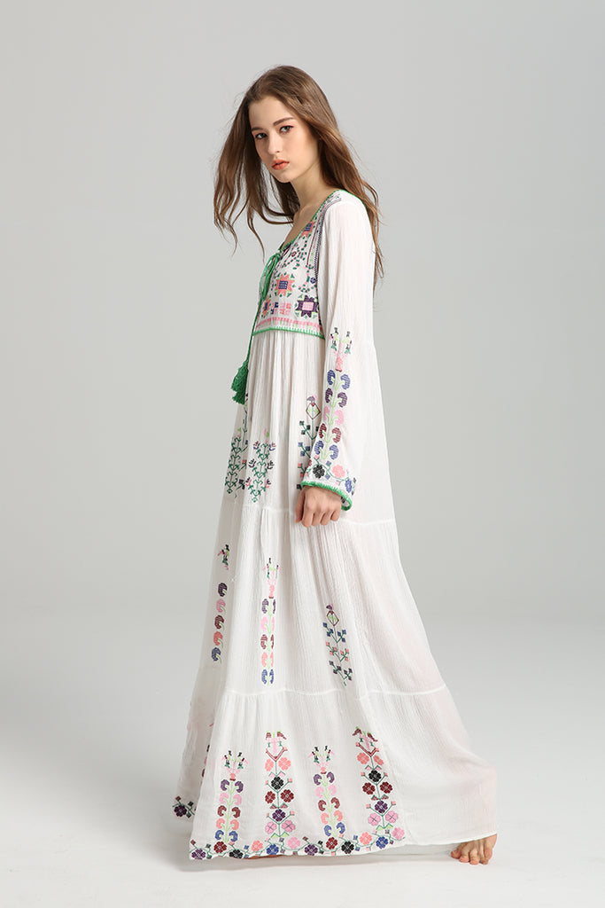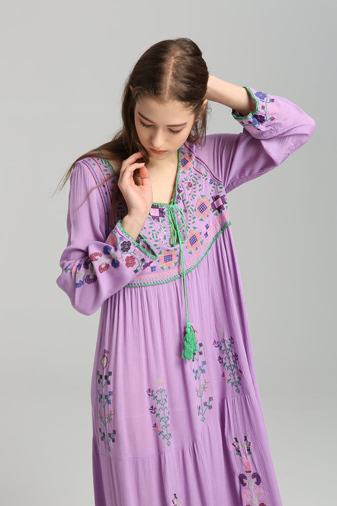Women Dresses Bohemian Fashionable Embroidered Flower Dress Lace-up Dress