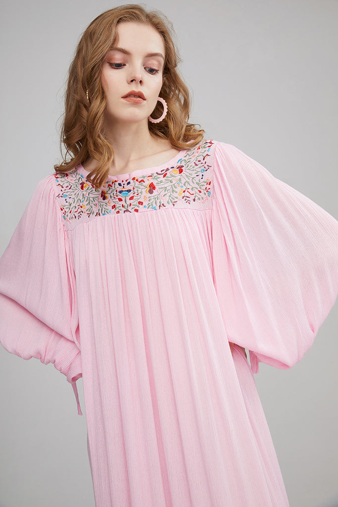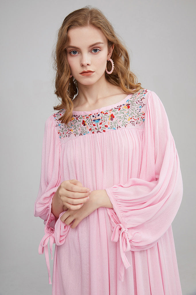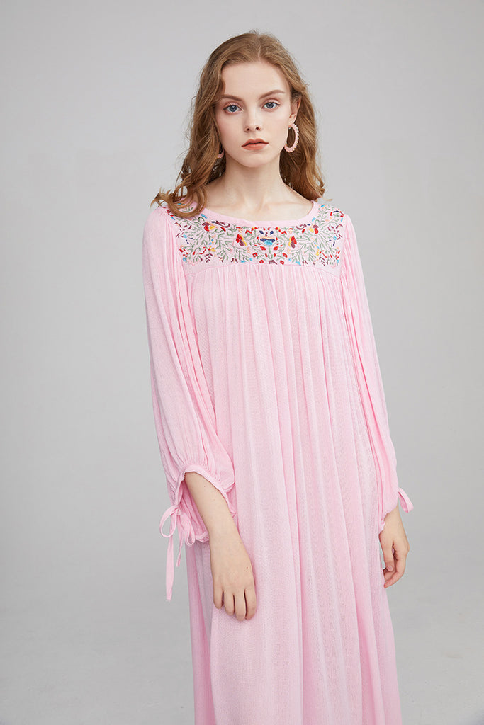 Bohemian Flower Embroidered Puff Sleeve Loose Vacation Style Long Dress Dress