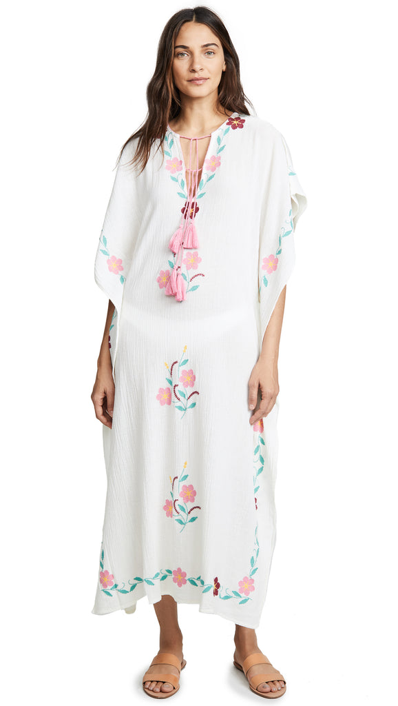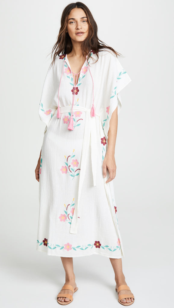 Women Dresses Bohemian Flower Embroidered V-neck Maxi Dress Vacation Sun Protection Blouse
