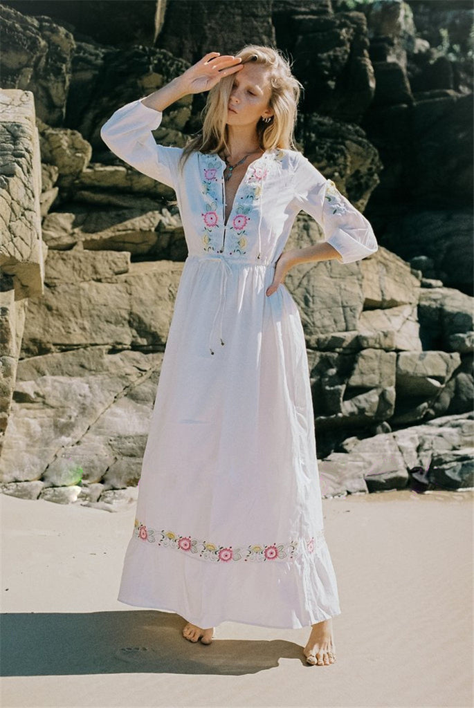 Women Dresses Bohemian Embroidered Flower Drawstring Waist Solid Color Vacation Style Dress