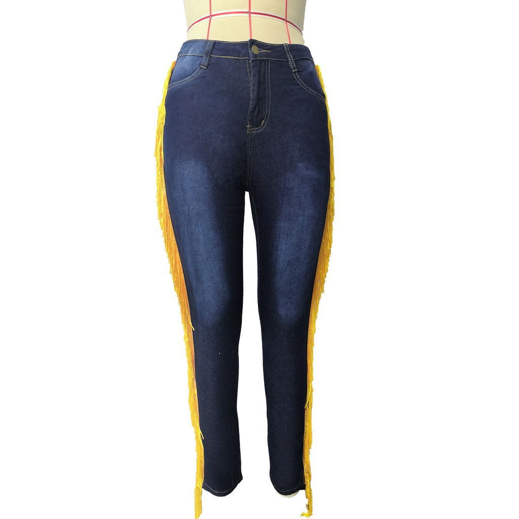 Women Plus Size Jeans High Waist Slim Tassel Denim Skinny Pants