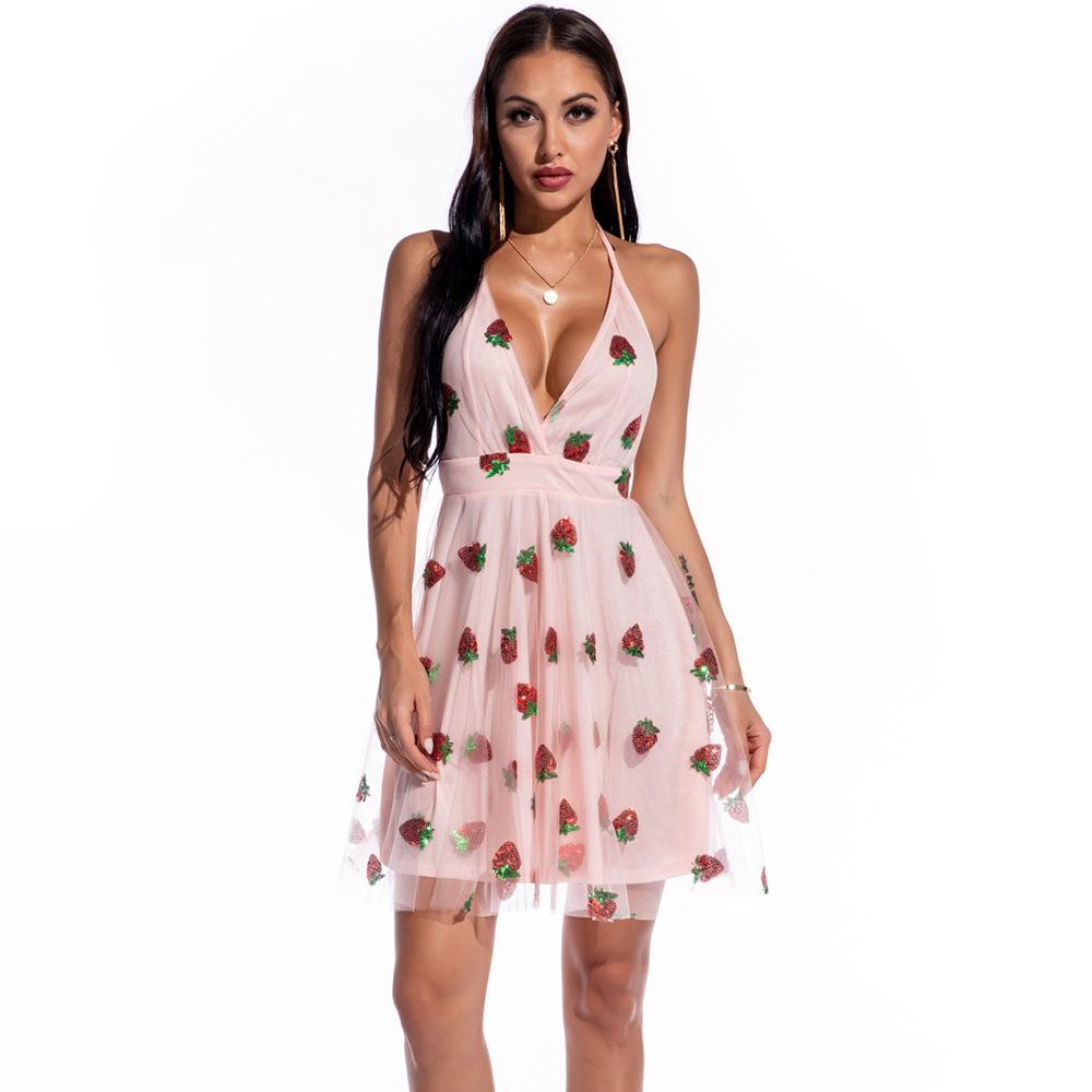 Sexy V-neck Strap Strawberry Sequins Mini Dress Swing dress