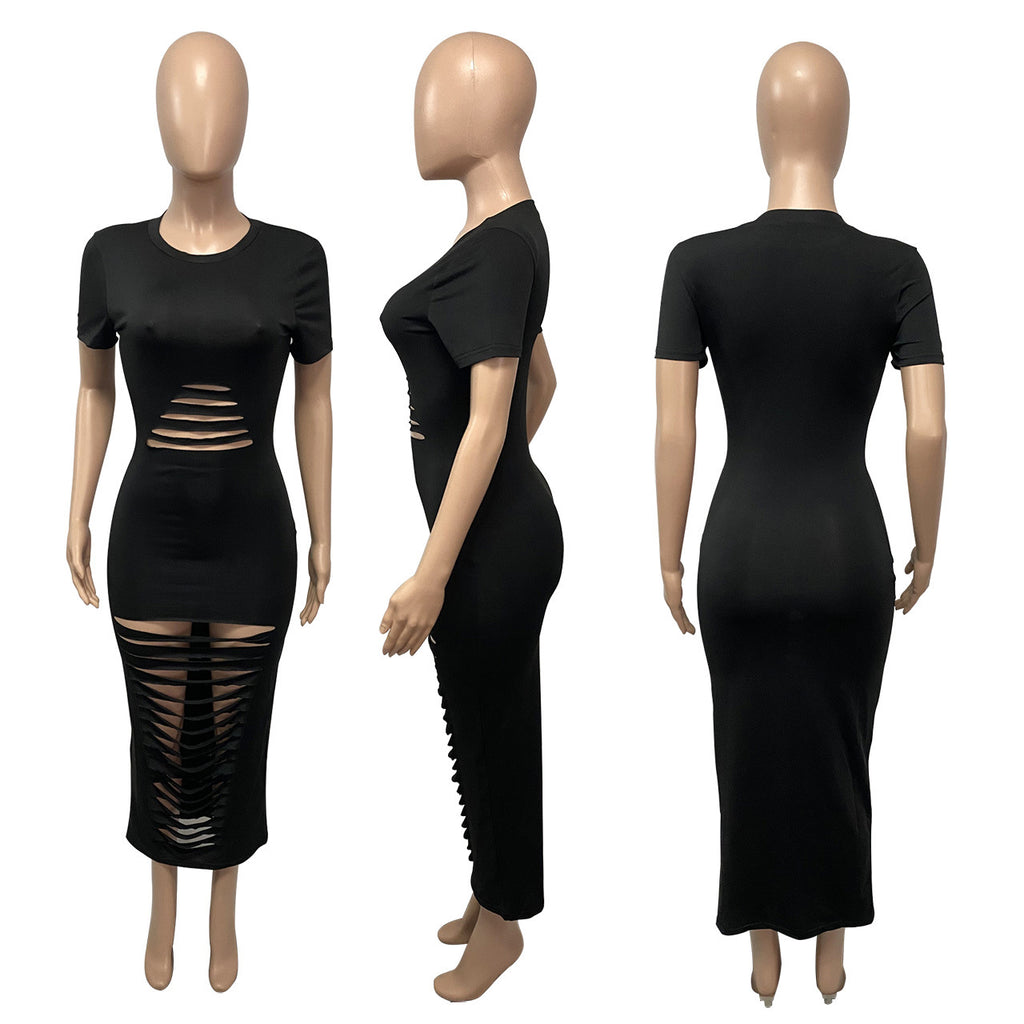 Solid Color Hollow Hole Burning Flower Slim Sexy Dress