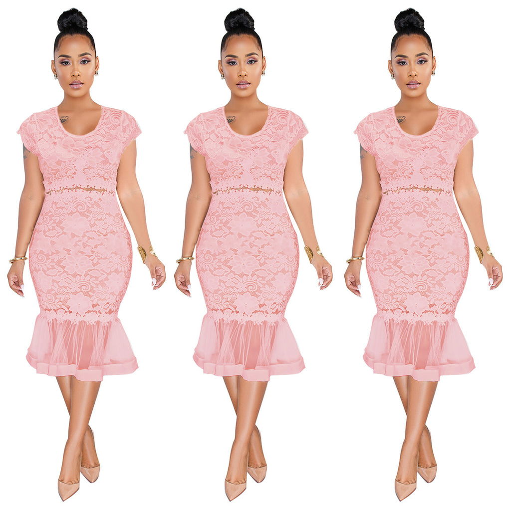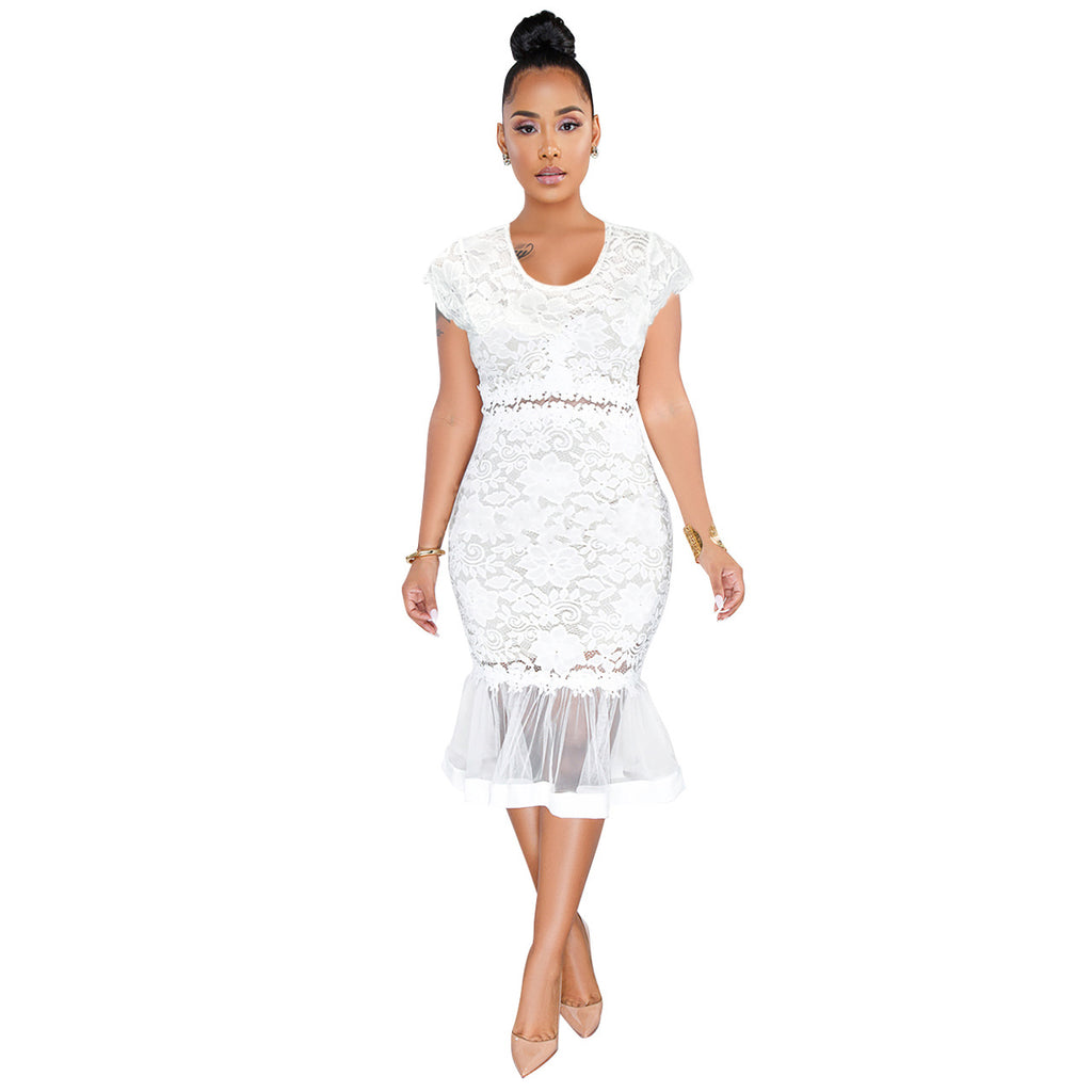Sexy round Neck Lace Fishtail Skirt Swing See-through Dress