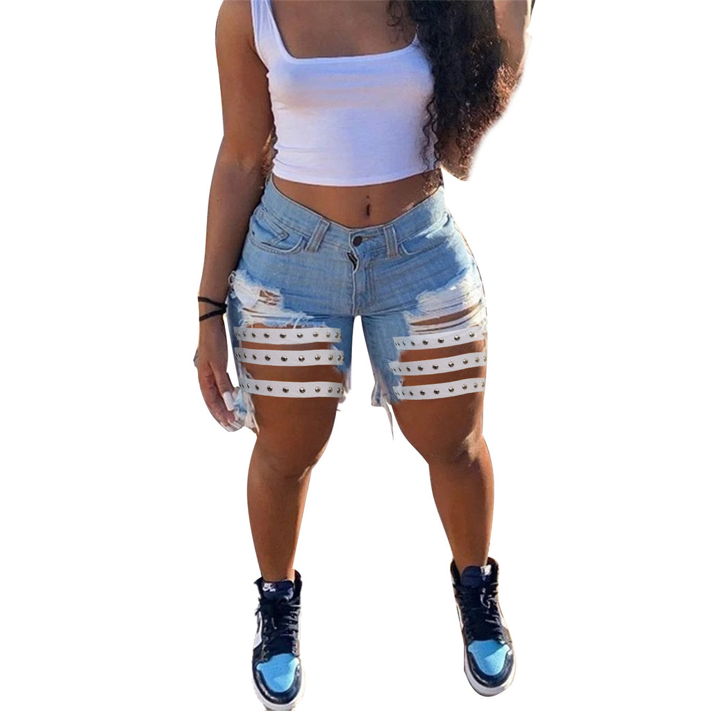 Women Plus Size Denim Shorts Rivet Ripped Denim Pants