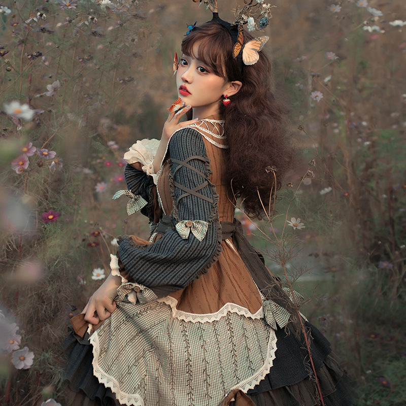 Gothic Lolita Harajuku Style Clothing Lolita Small Skirt Op Vintage Pastoral Style Skirt Color Contrast Patchwork Autumn and Winter