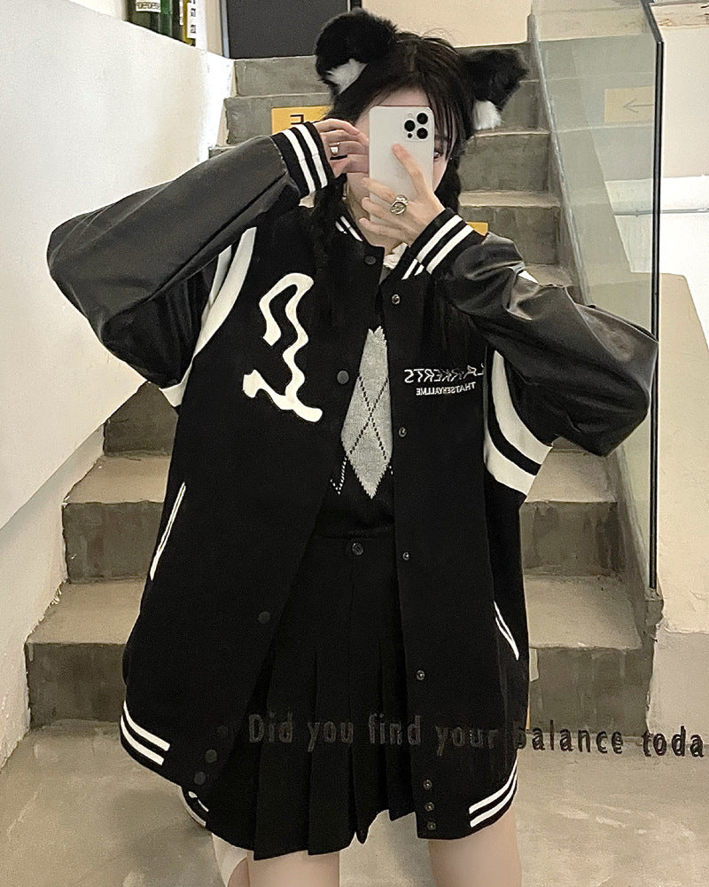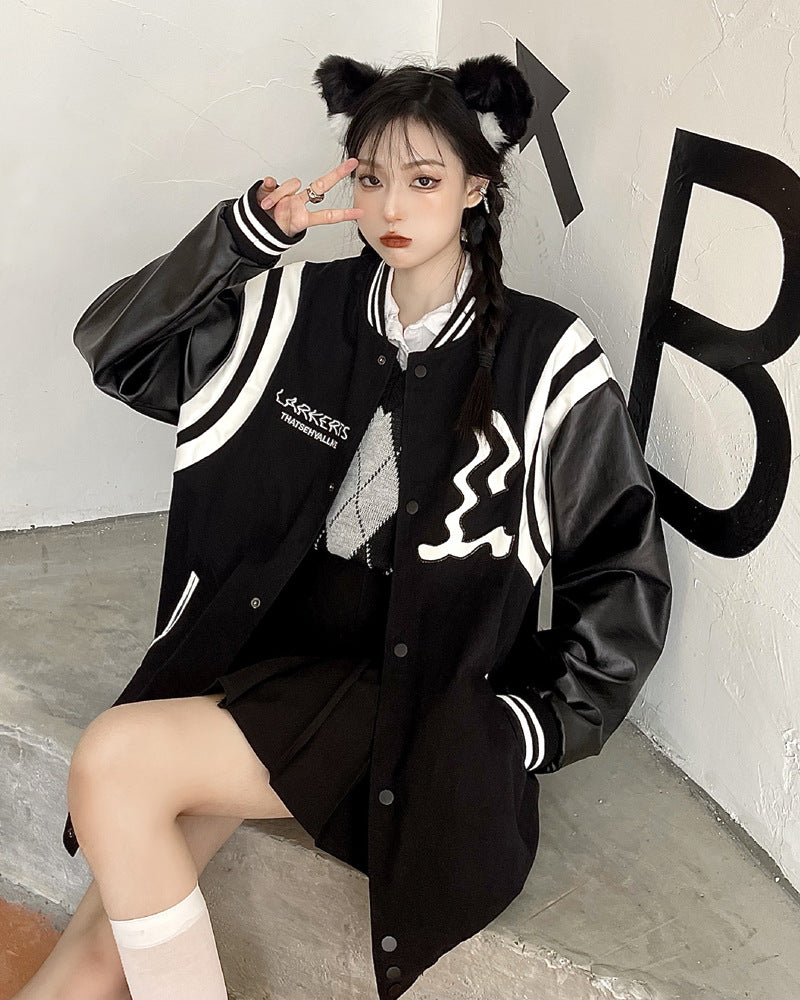 Gothic Lolita Harajuku Style Clothing Autumn and Winter Stitching Baseball Uniform Loose Leather Jacket Jacket