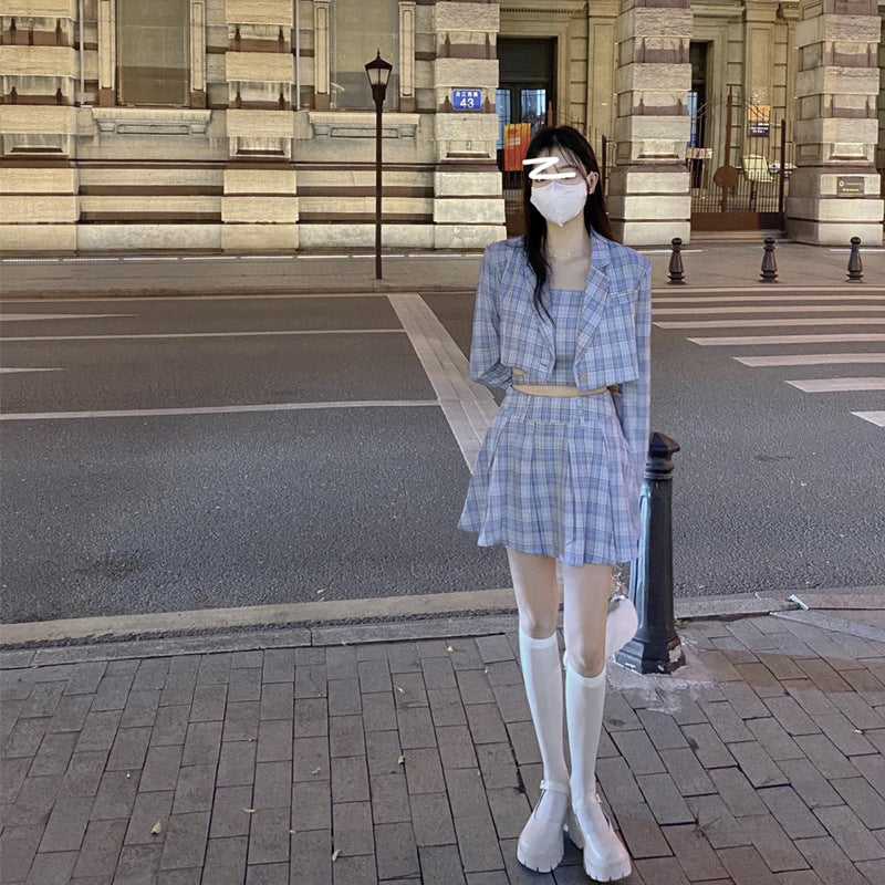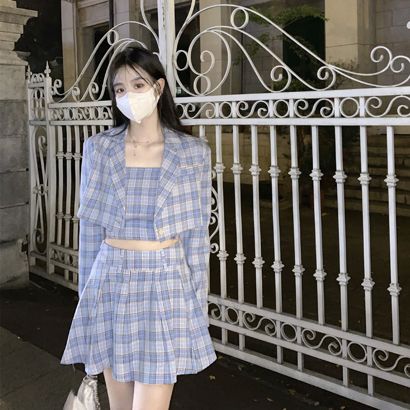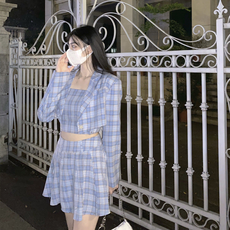 Gothic Lolita Harajuku Style Clothing Early Autumn Plaid Coat Short Suit Top Vest Pleated Skirt Suit
