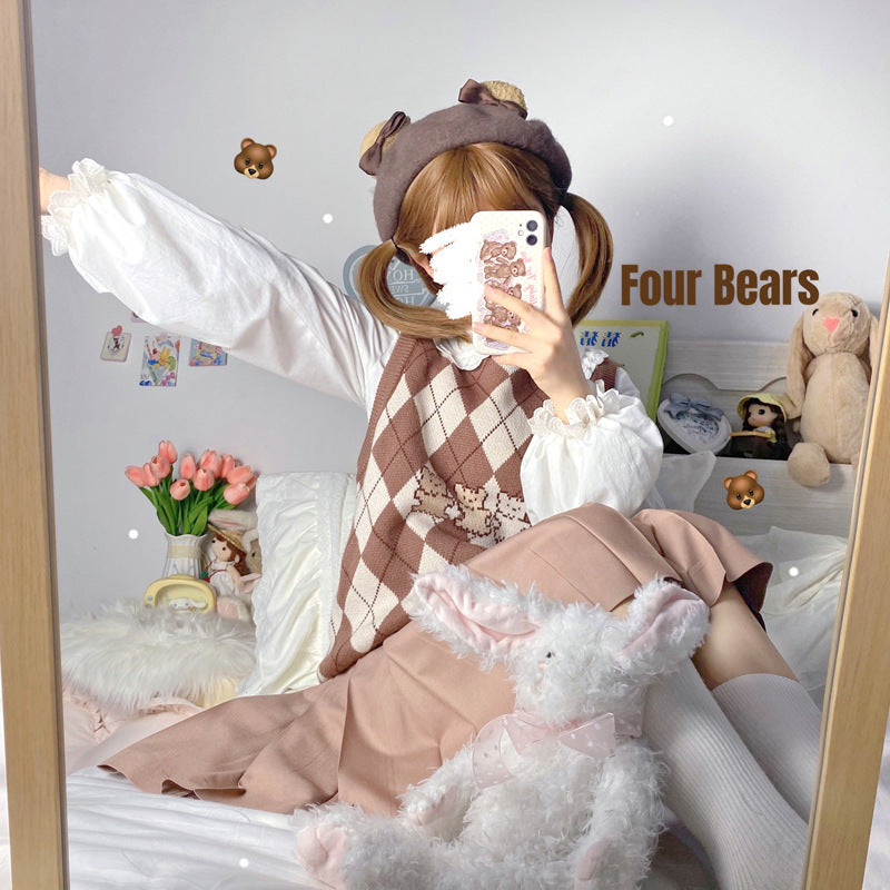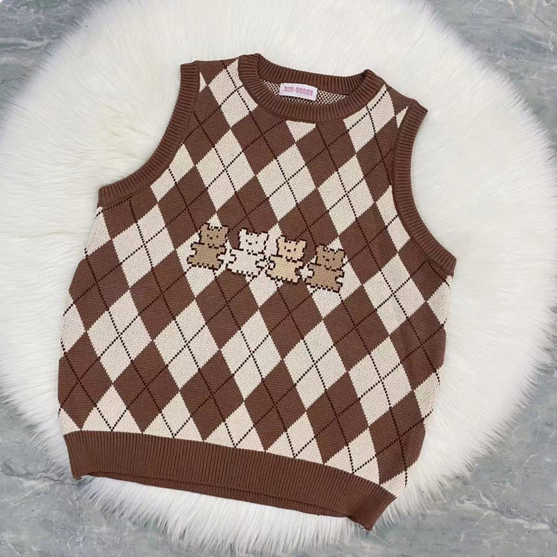 Gothic Lolita Harajuku Style Clothing Four Bear Rhombus Color Matching Sleeveless Sweater Vest