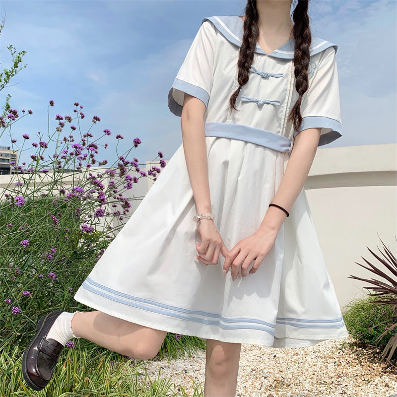 Gothic Lolita Harajuku Style Clothing Embroidered Chinese Knot Button Contrast Color Short Sleeve Dress