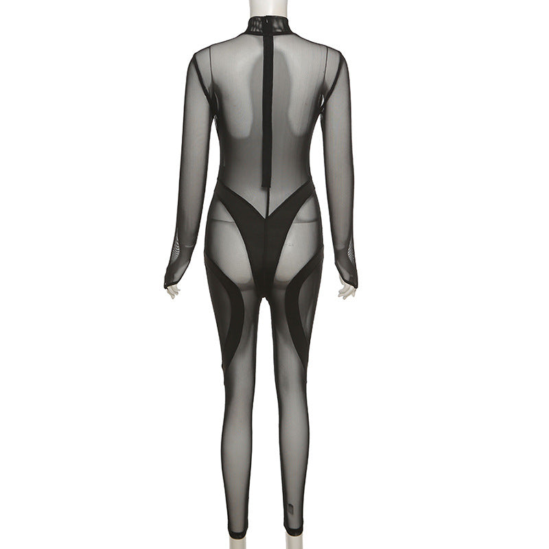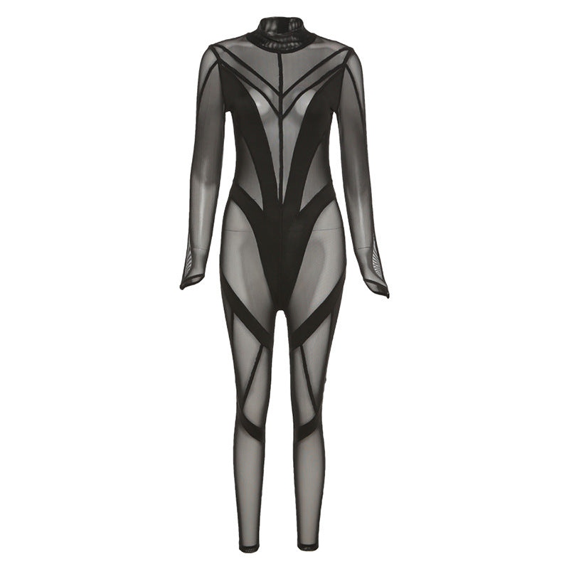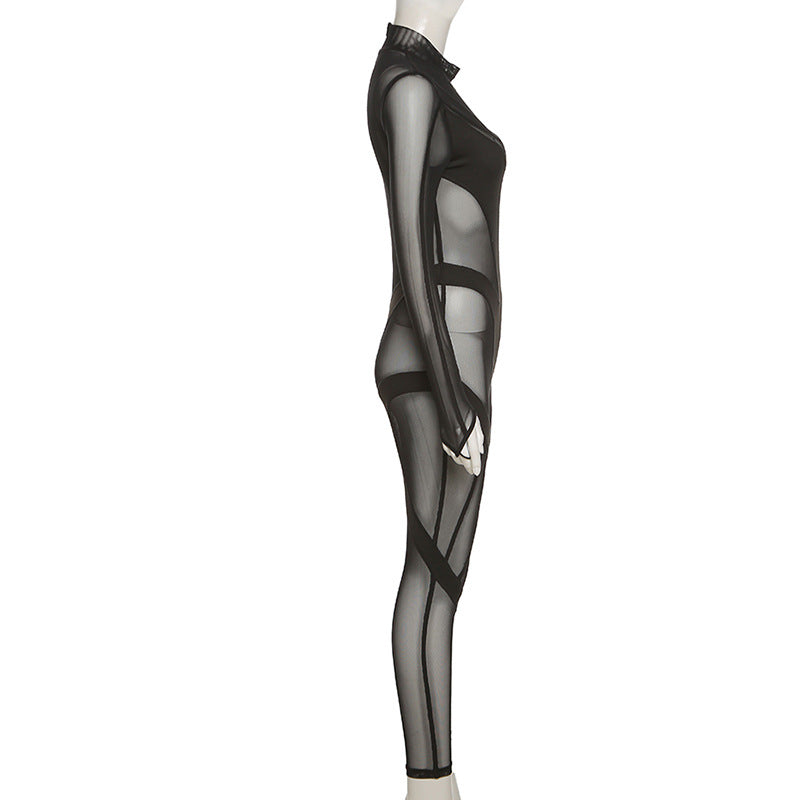 Fall Women's Clothing Sexy Mesh See-through Slim Fit Patchwork High Waist One-Piece Trousers