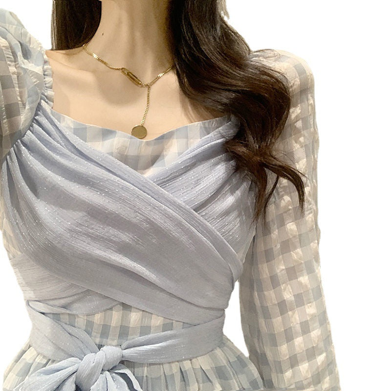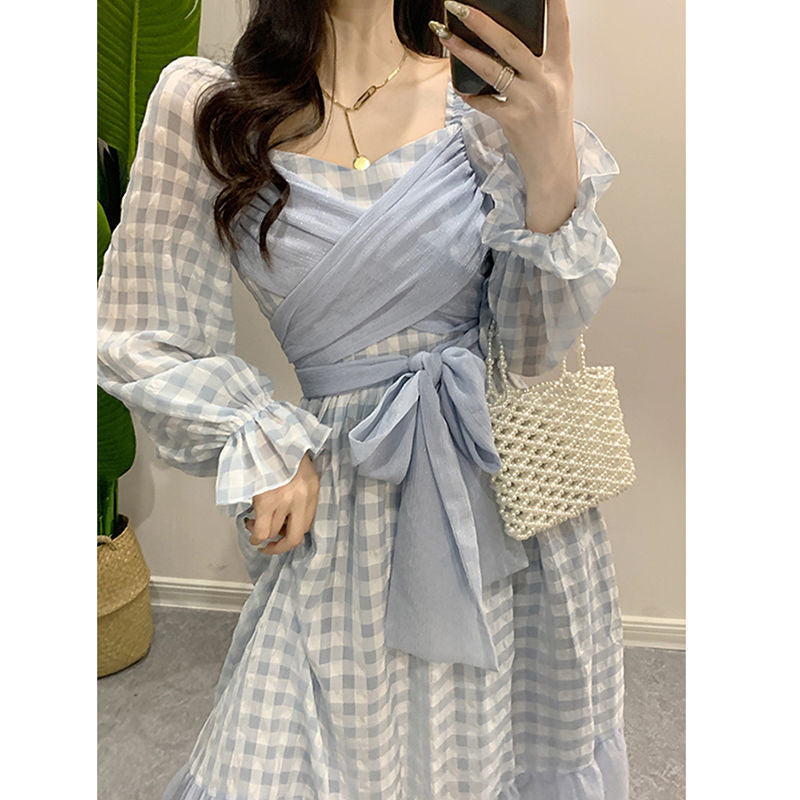 Fairy Dress Fairy Skirt Spring French Retro Bubble Long Sleeve Lace-up Ruffled Plaid Dress Midi Princess Dress