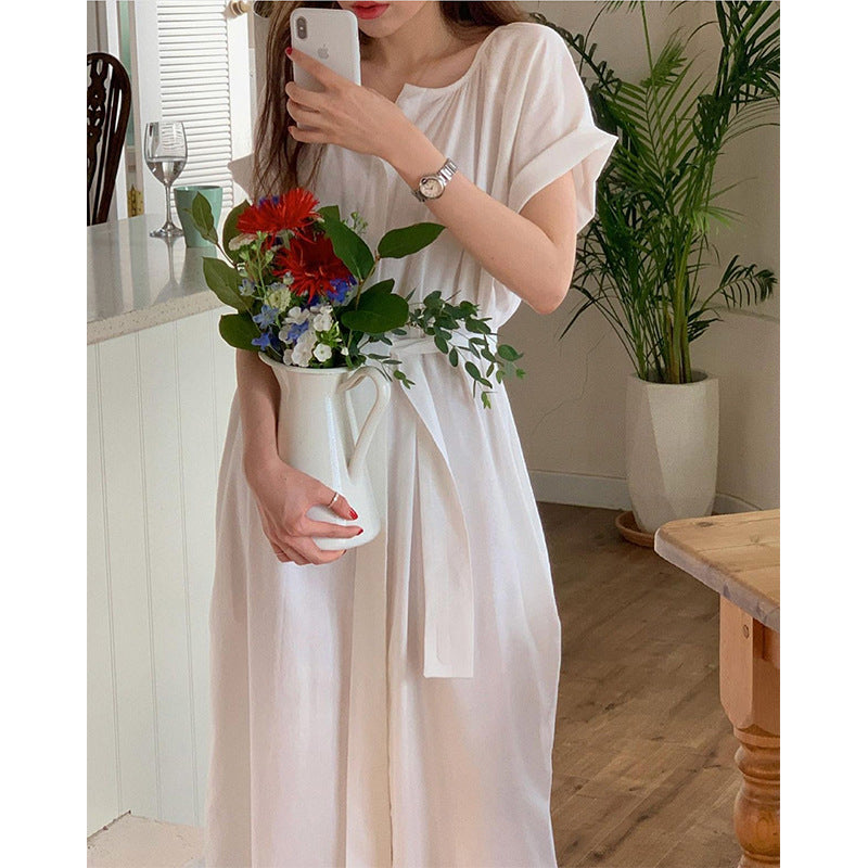 Fairy Dress Summer T Solid Color High Waist Slimming round Neck Midi Dress