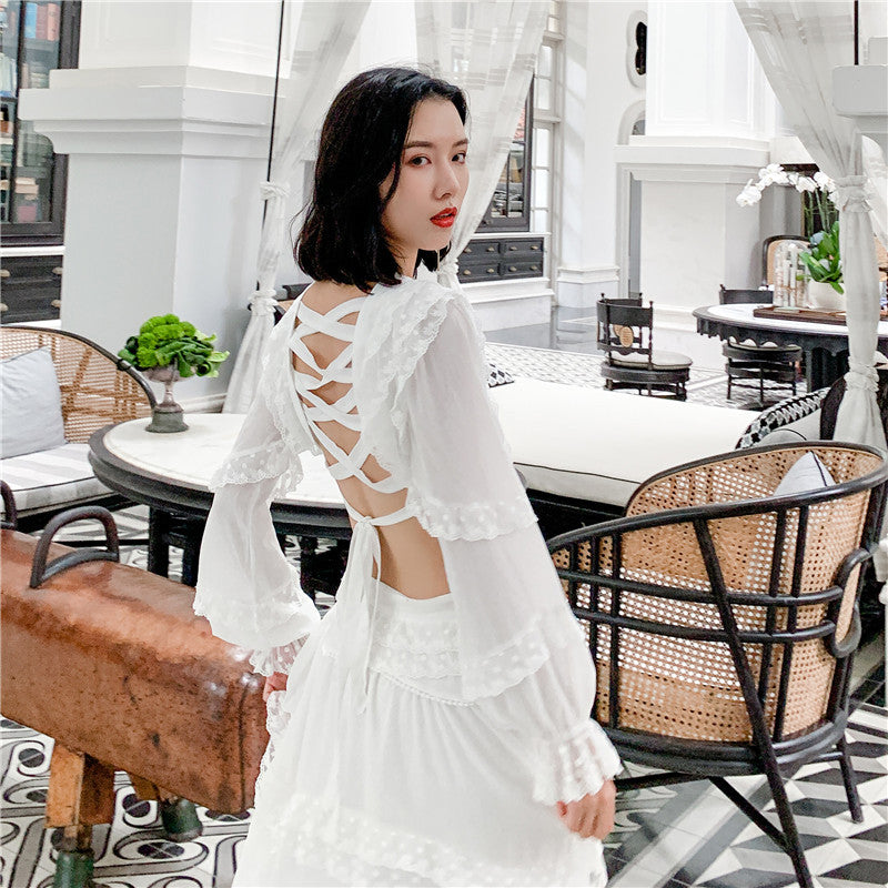 Fairy Dress Holiday White Patchwork Waist-Slimming Large Swing Dress Backless Fairy Dress