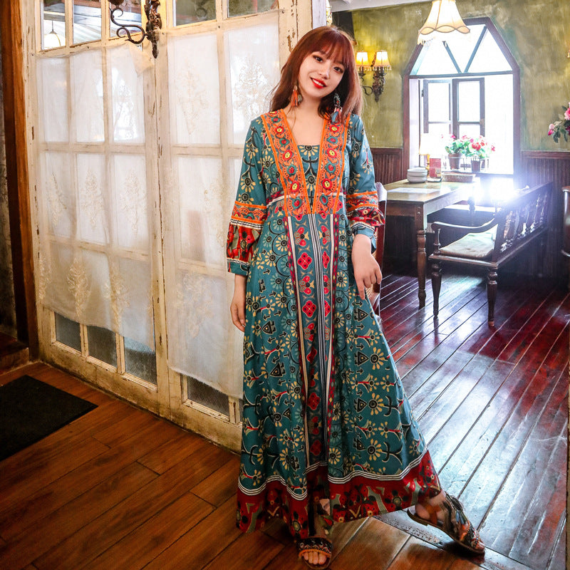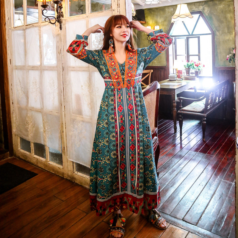 Beth Dutton Bohemian Winter Dress Midi Dresses Embroidered Ethnic Print Slim Fit Large Swing Dress