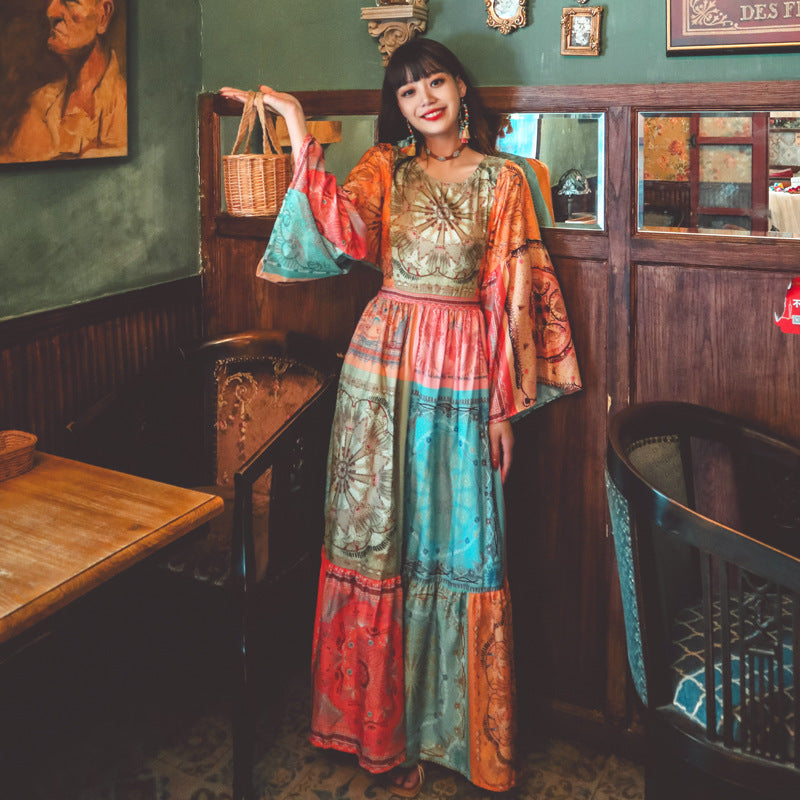 Beth Dutton Bohemian Dress Winter Autumn Midi Dresses Flare Sleeve Contrast Color Round Neck 3/4 Sleeve Color Holiday Dress