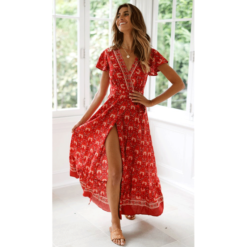 Beth Dutton Bohemian Dress Summer Spring Midi Dresses Sexy V-neck Cardigan Waist Print Dress