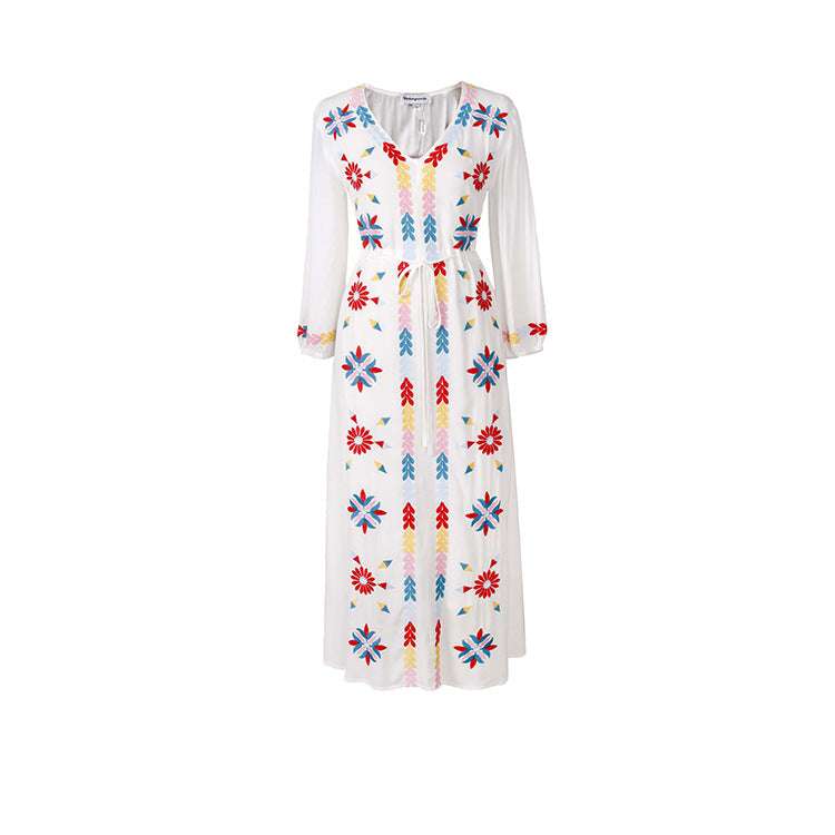 Beth Dutton Bohemian Dress Winter Autumn Midi Dresses Embroidered V-neck Lace-up Waist-Controlled Slimming Holiday Dress