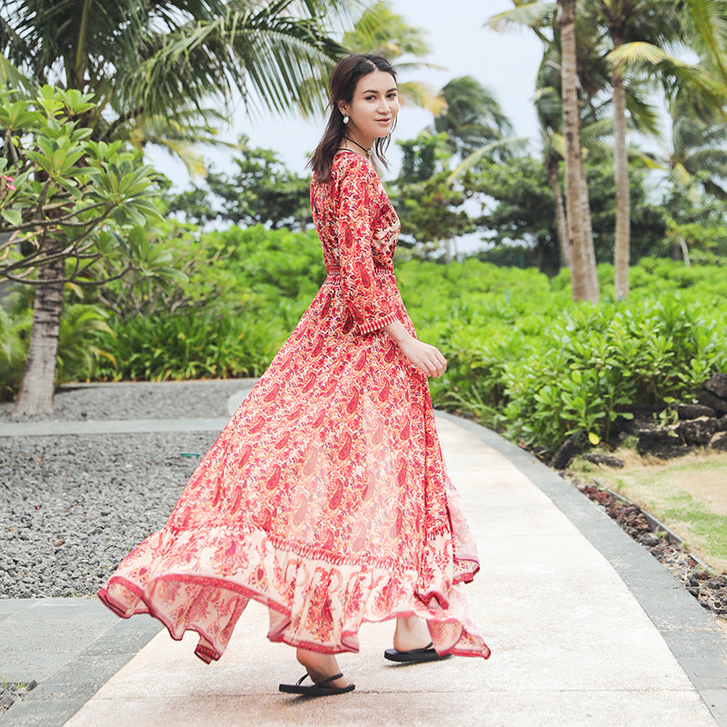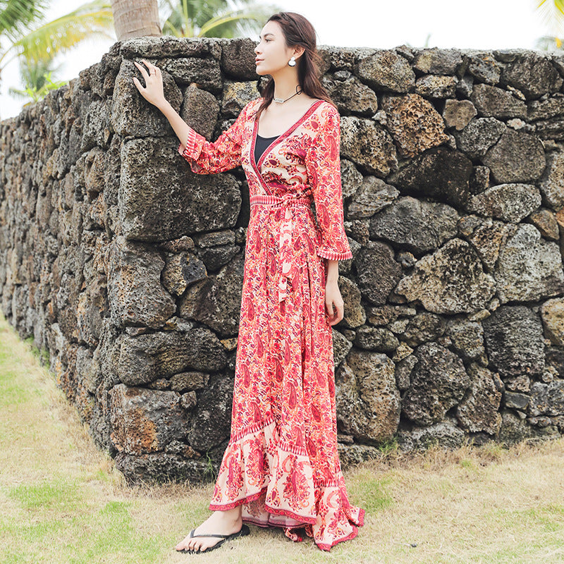Beth Dutton Bohemian Dress Winter Autumn Midi Dresses V-neck Oversized Skirt Holiday Floral Print Dress