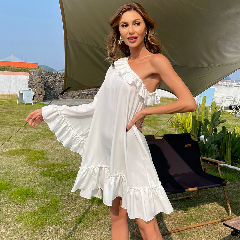 Bohemian Beach Dress off-Shoulder Ruffled Hem Solid Color