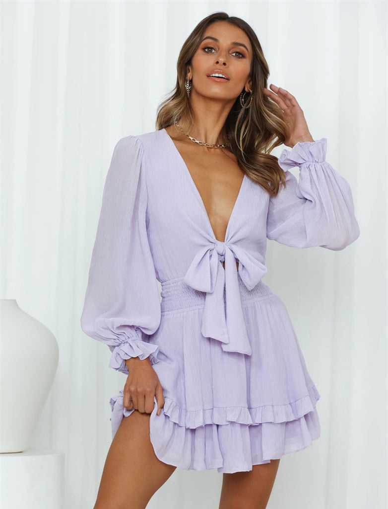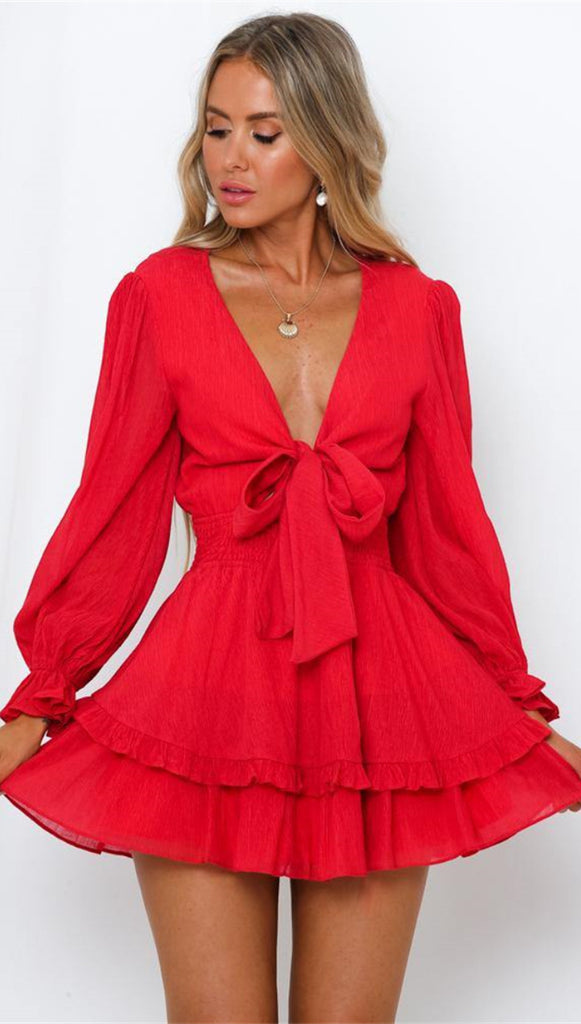 Dakota Johnson Red Mini Dress V-neck Long Sleeve Lace-up