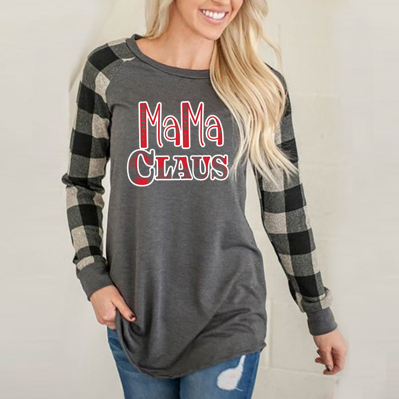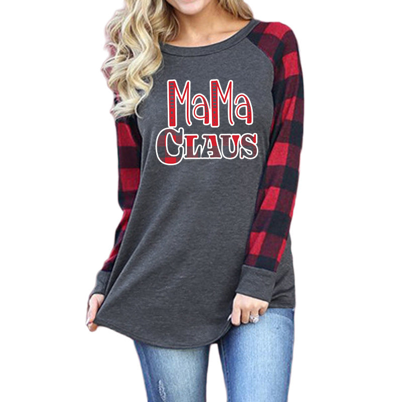 Boy Mama T Shirts Red Plaid Mama Claus Print Contrast Color