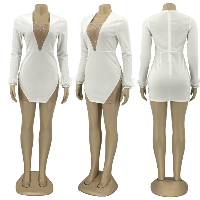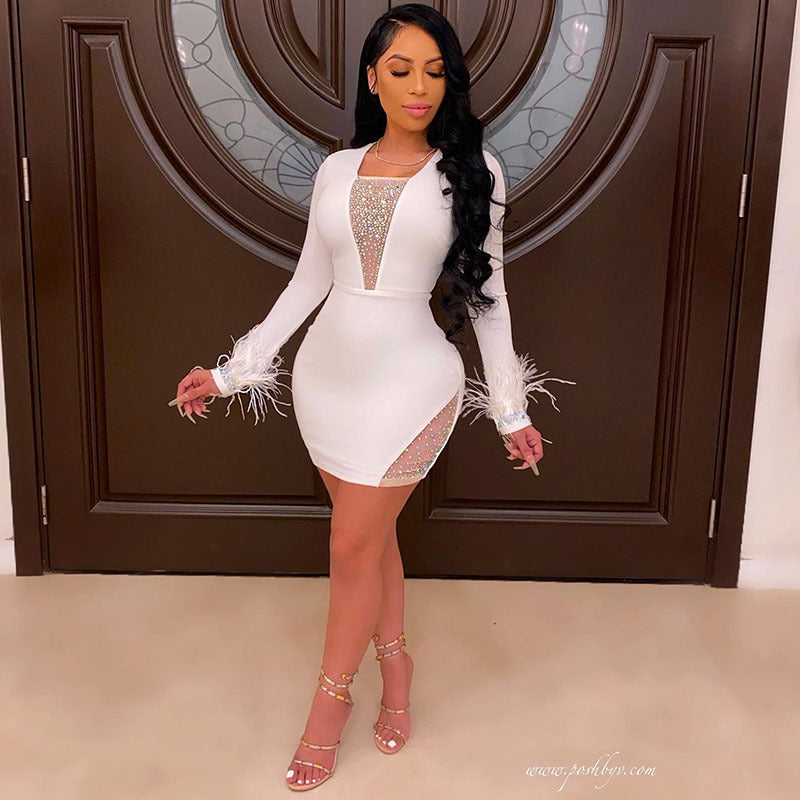 Bella Hadid Dress Mesh Rhinestone Stitching Feather Decoration Slim-Fit Sheath Dress