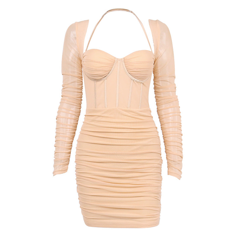 Bella Hadid Dress Mesh Fishbone Pleated Backless Tight Suspender Dress