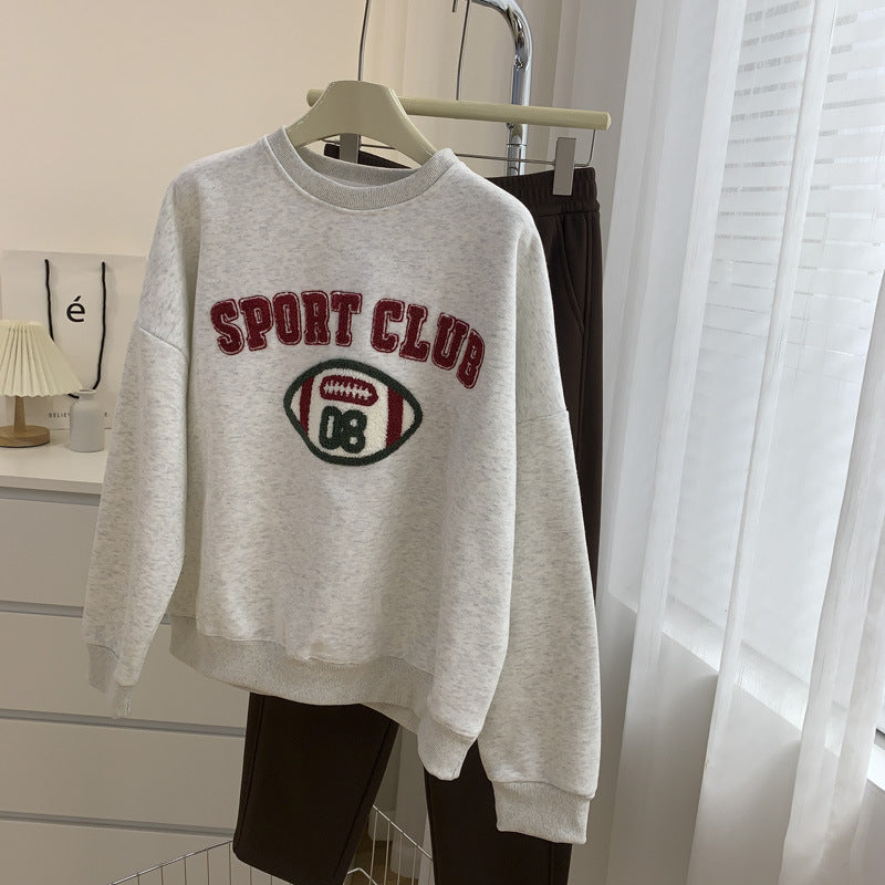 Diana Harvard Sweatshirt Vintage Towel Embroidery Fleece-Lined Crew Neck Sweater Pullover Top