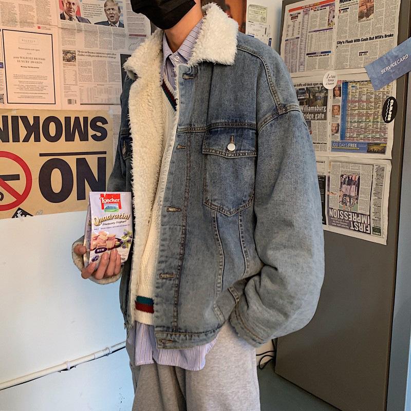 Cotton-Padded Coat Men's Loose Lapels Wool Cotton-Padded Coat Casual Fleece and Thick Denim Jacket Large Size Loose Men Denim Jacket